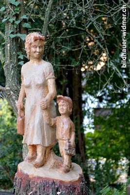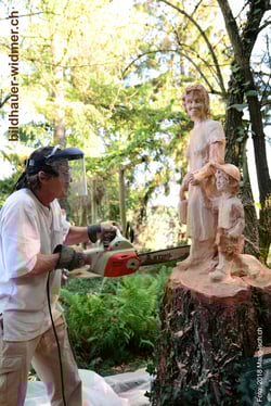 Paul Widmer schnitzt "Grosi" mit Enkel in eine Lärche