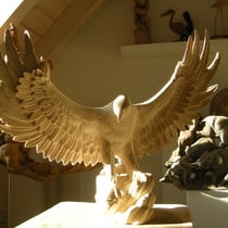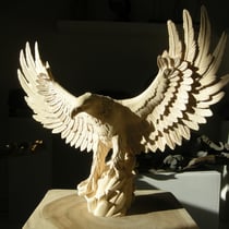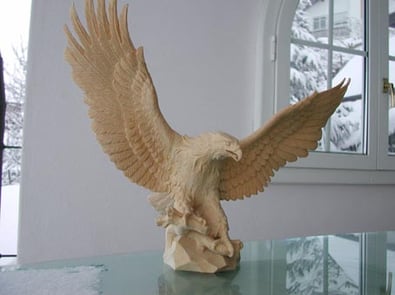 Adler mit offenen Flügeln aus Ahornholz gesägt, gefräst und geschnitzt.